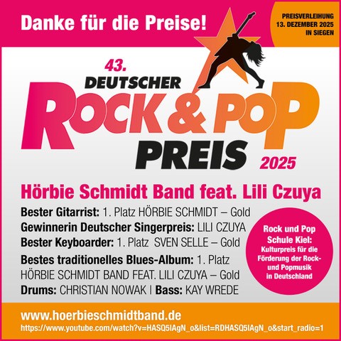 Die Hörbie Schmidt Band hat den Deutschen Rock & Pop Preis 2015 in 10 Kategorien, 2014 in 8 Kategorien gewonnen.